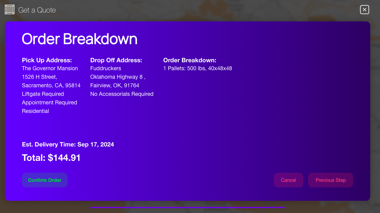 Now we're at the grand finale of your first Oway order, the Order Breakdown. This is the place for you to confirm all your details. Once this is confirmed (lower left corner), it gets sent out to all of our carriers. This is why it is vital for all the details to be correct!