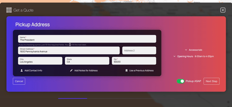 Next you will need to run through all the details required to send an order out to one of our many Oway Rideshare Partners. Include as much detail as possible, this just assures all potential issues will be covered. Below, we've included a table of all the various stages and things to be mindful of, but the best way to learn this process... is to place a quote!