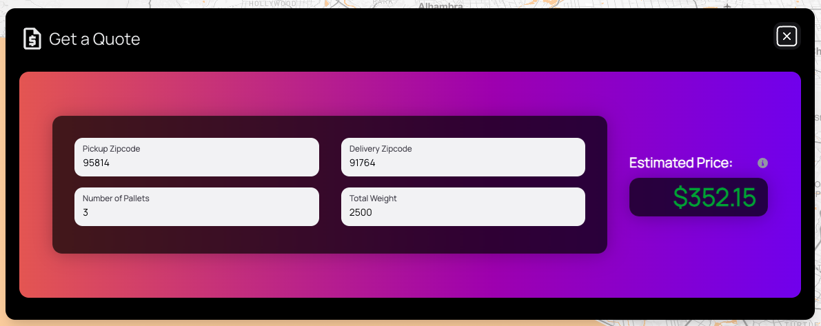 Once you're within the Get a Quote page you should see four fields that you need to fill out; Pickup Zipcode, Delivery Zipcode, Number of Pallets, and Total Weight. You do not need accessorials in quoting, that will be defined in our Create an Order section.